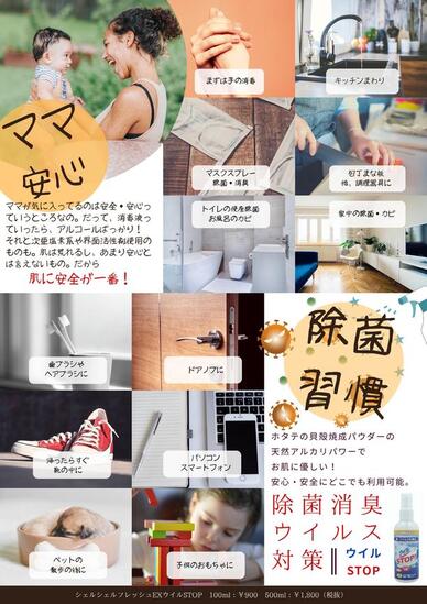 シェルフレッシュ EX・ウイルSTOP は、ホタテの貝殻と水だけから作られ た100%ナチュラルな除菌・消臭剤です。ホタテの貝殻から作られたホタテの貝殻水溶液は、強アルカリ性のチカラを 持っています。